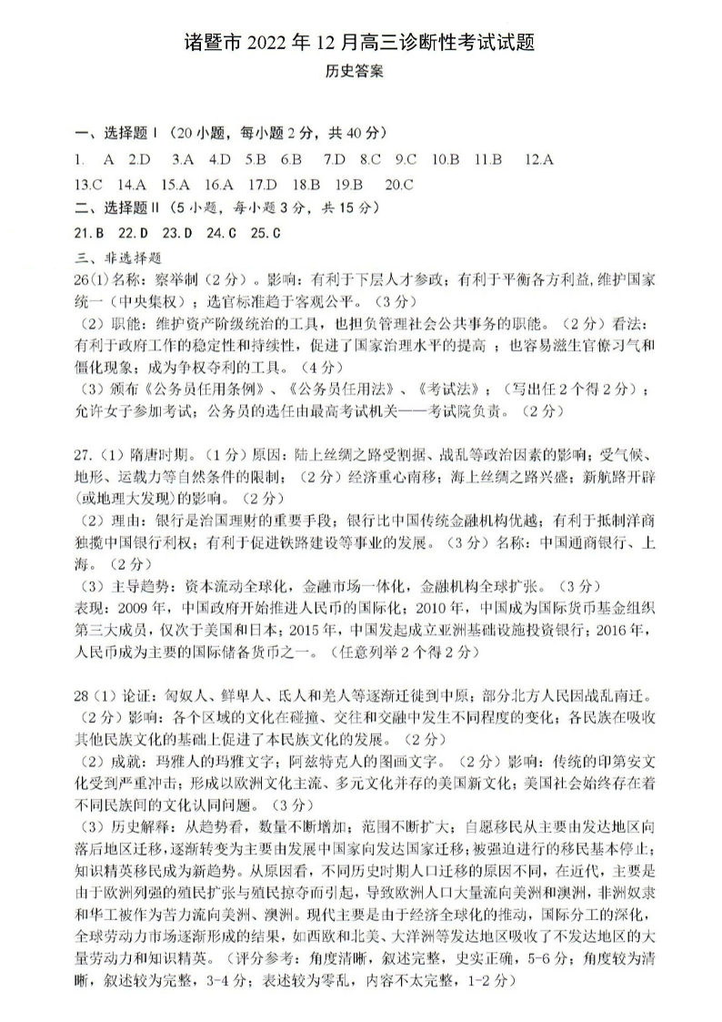 高三历史答案--浙江省诸暨市2022-2023学年高三上学期12月诊断性性考试