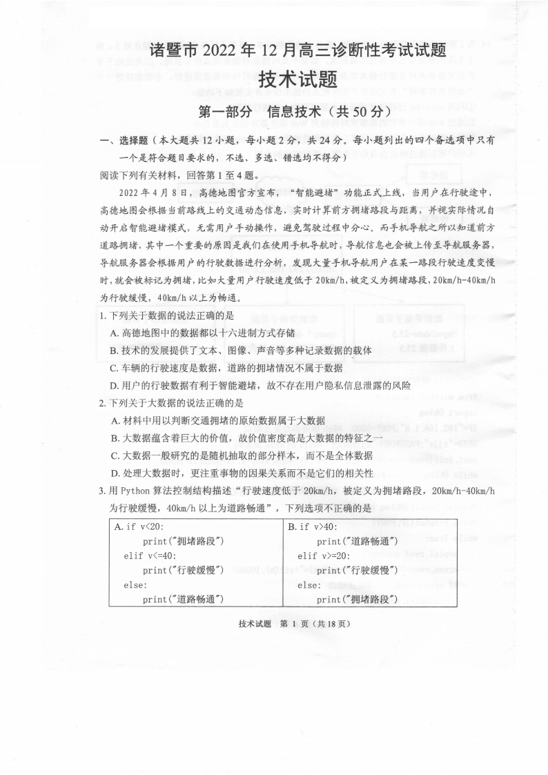 高三技术--浙江省诸暨市2022-2023学年高三上学期12月诊断性性考试