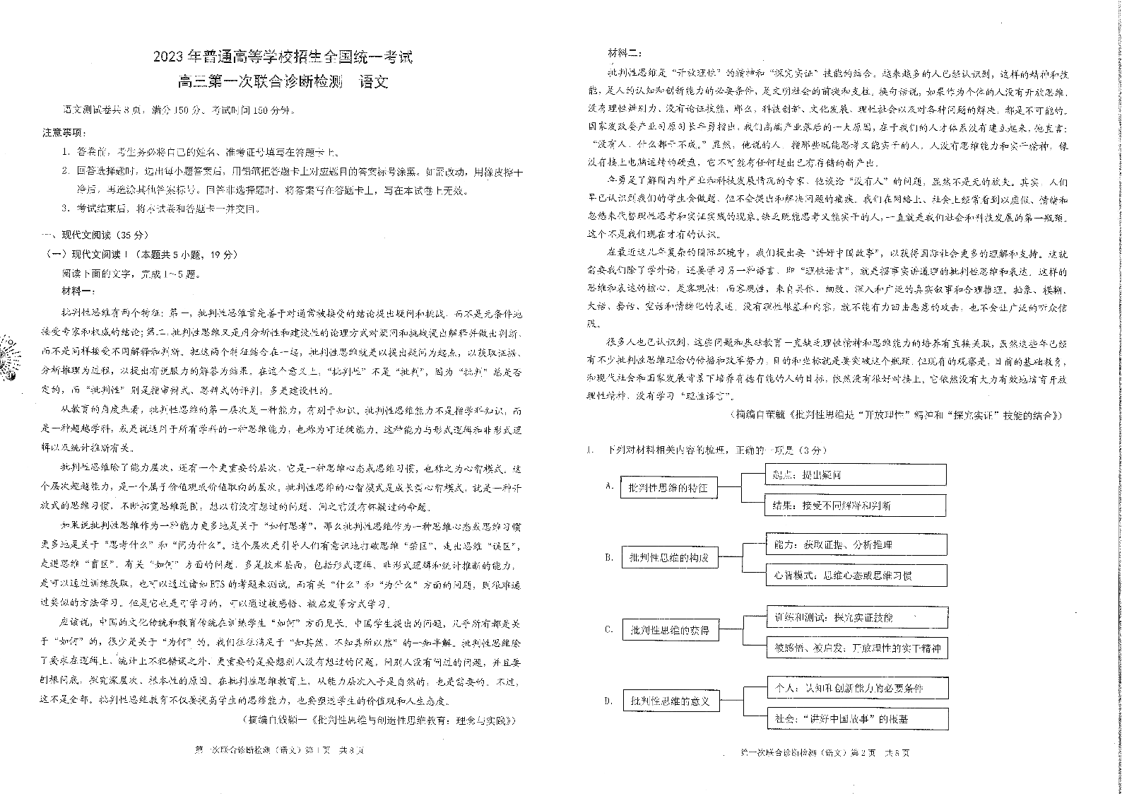 高三语文--重庆一诊康德卷2023年普通高等学校招生全国统一考试