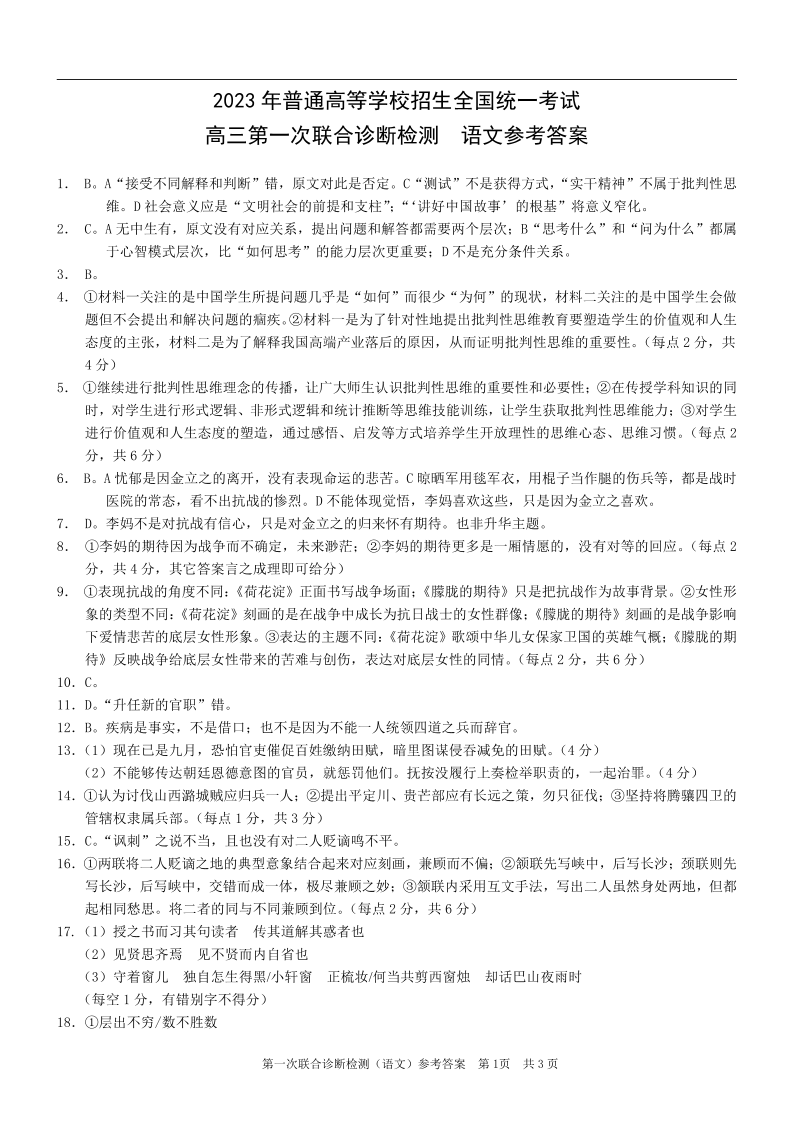 高三语文答案--重庆一诊康德卷2023年普通高等学校招生全国统一考试