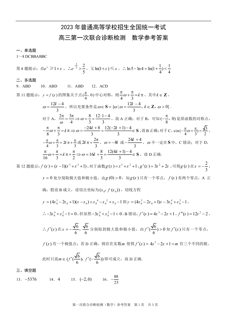 高三数学答案--重庆一诊康德卷2023年普通高等学校招生全国统一考试