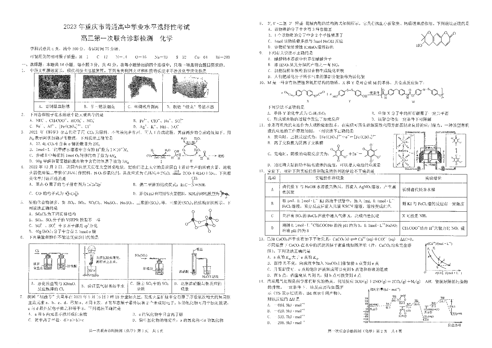 高三化学--重庆一诊康德卷2023年普通高等学校招生全国统一考试
