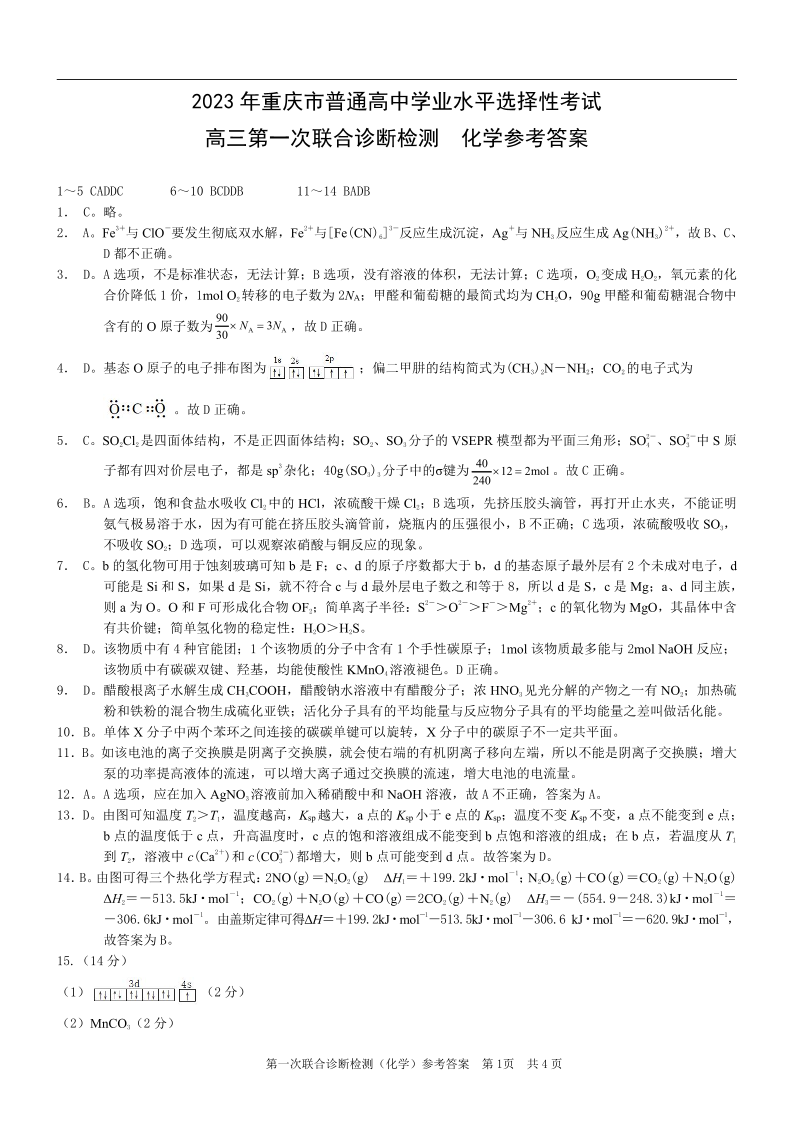 高三化学答案--重庆一诊康德卷2023年普通高等学校招生全国统一考试