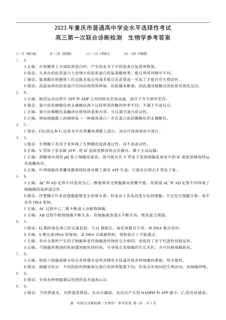高三生物答案--重庆一诊康德卷2023年普通高等学校招生全国统一考试