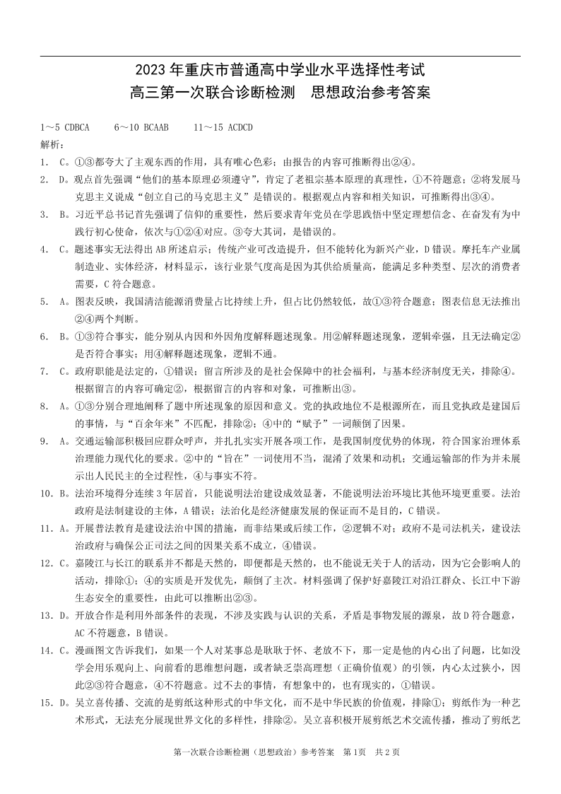高三政治答案--重庆一诊康德卷2023年普通高等学校招生全国统一考试