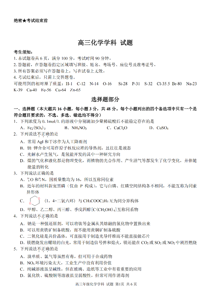 高三化学--浙江省金丽衢十二校、七彩阳光等校2022-2023学年高三下学期3月联考