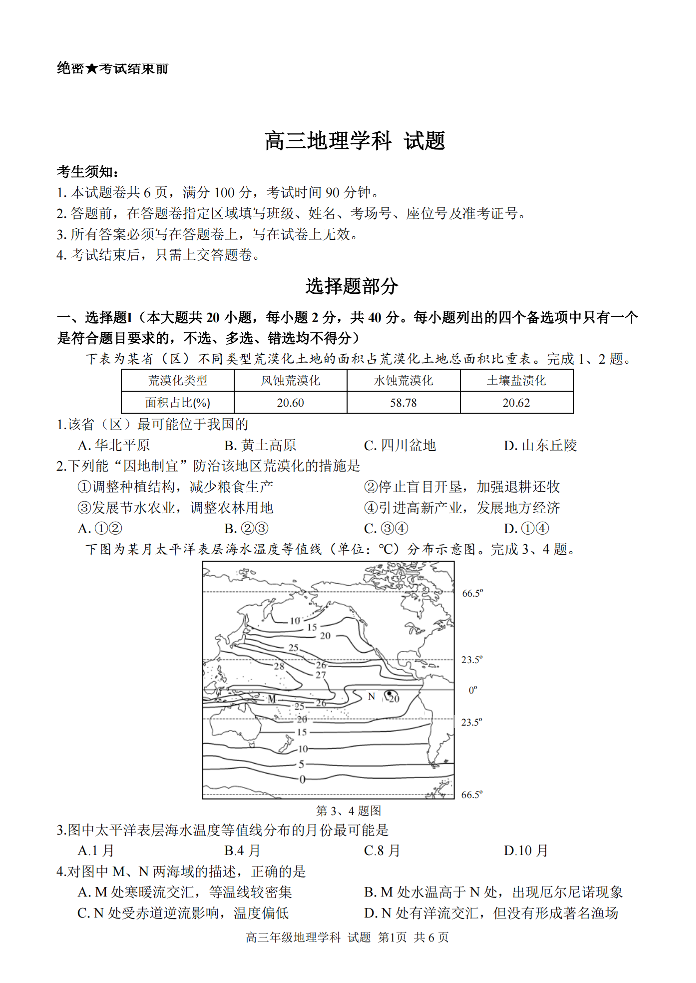 高三地理--浙江省金丽衢十二校、七彩阳光等校2022-2023学年高三下学期3月联考