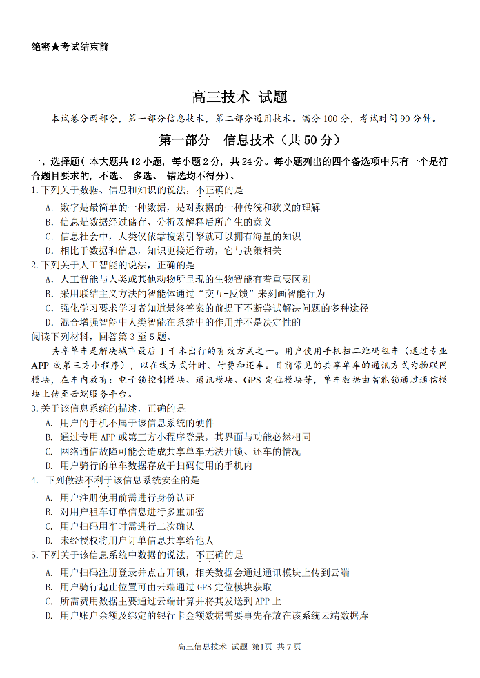 高三信息技术--浙江省金丽衢十二校、七彩阳光等校2022-2023学年高三下学期3月联考