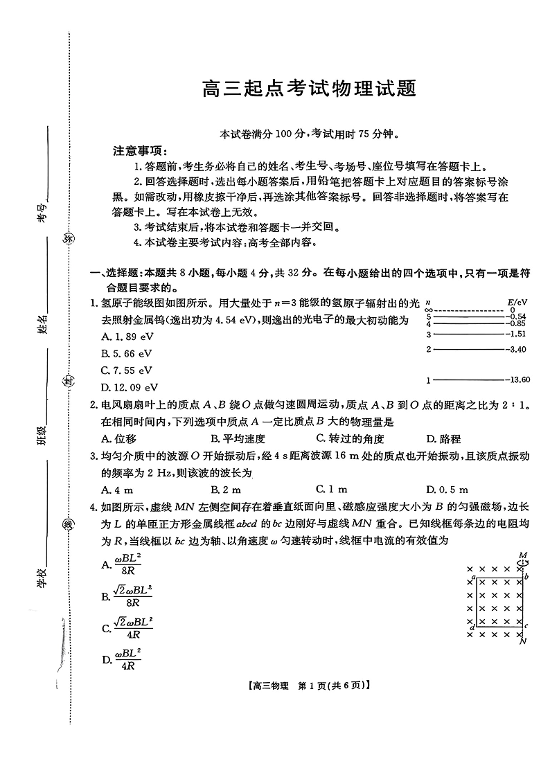 高三物理--安徽省皖西南高中振兴发展联盟高三起点考试