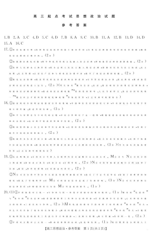 高三政治答案--安徽省皖西南高中振兴发展联盟高三起点考试