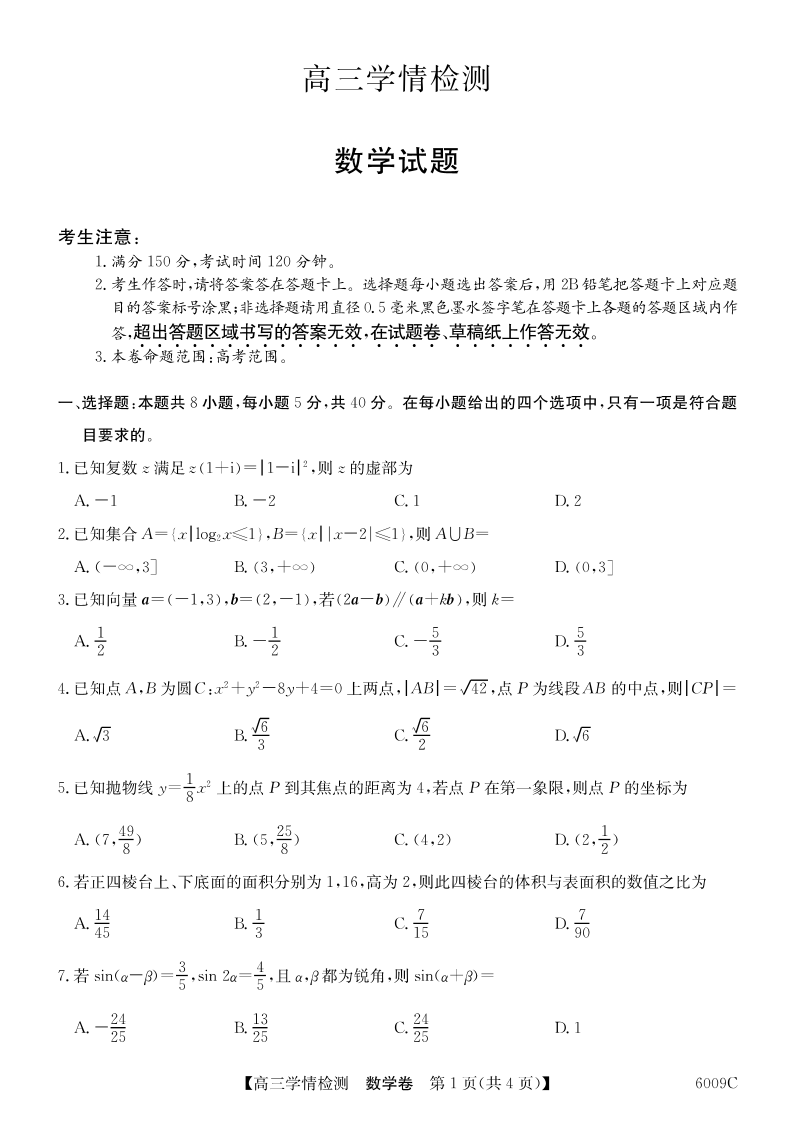 高三数学--安徽省县中联盟2026届高三上学期8月学情检测