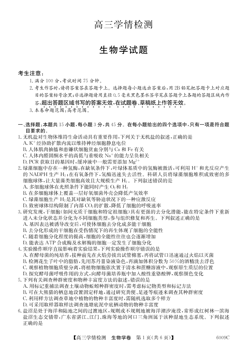 高三生物--安徽省县中联盟2026届高三上学期8月学情检测