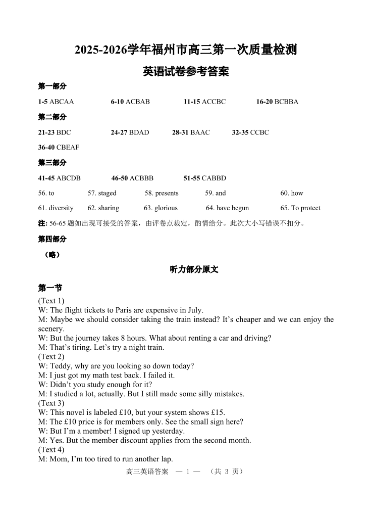 高三英语答案--福建省福州市2026届高三年级第一次质量检测(福州一检)
