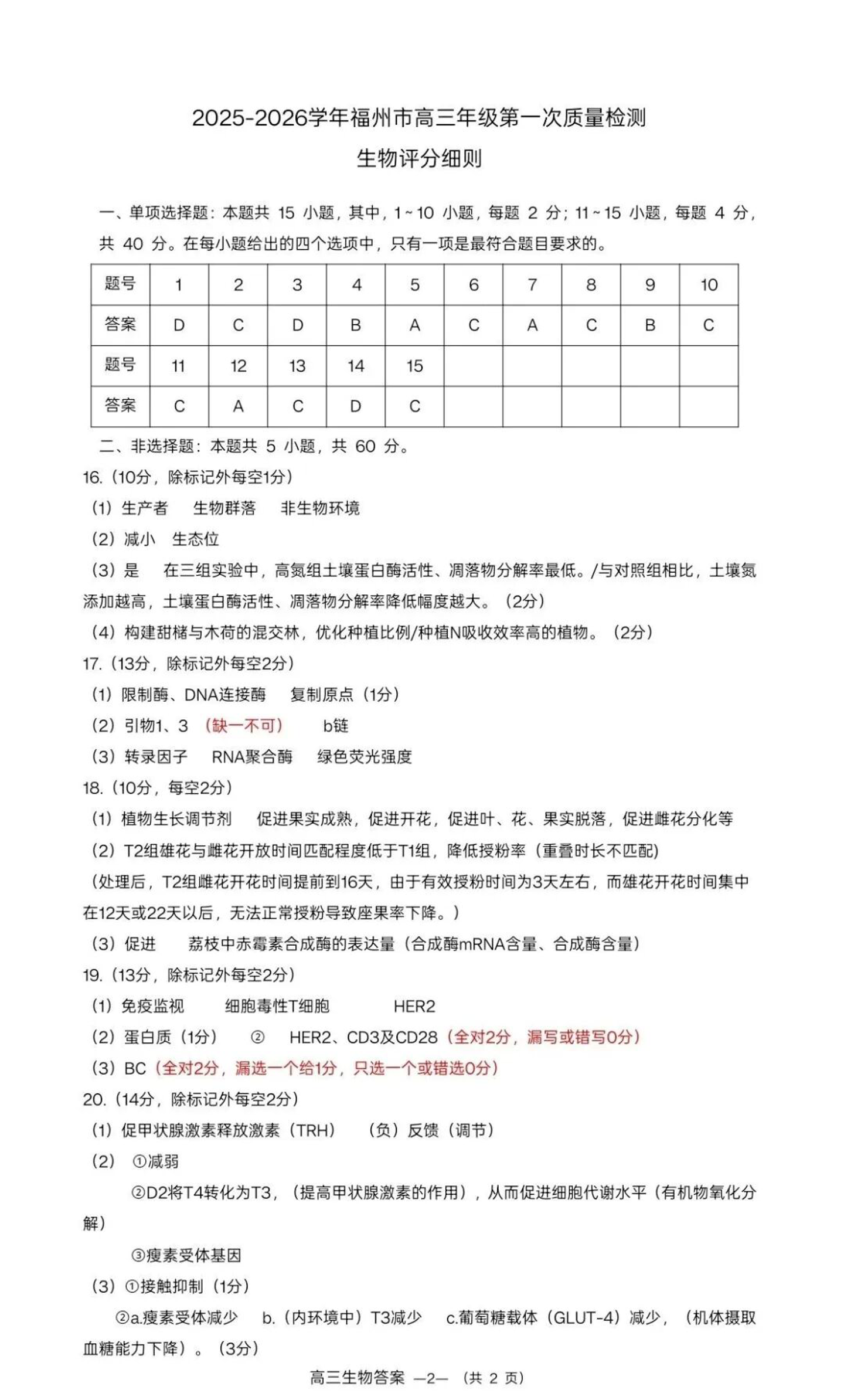 高三生物答案--福建省福州市2026届高三年级第一次质量检测(福州一检)