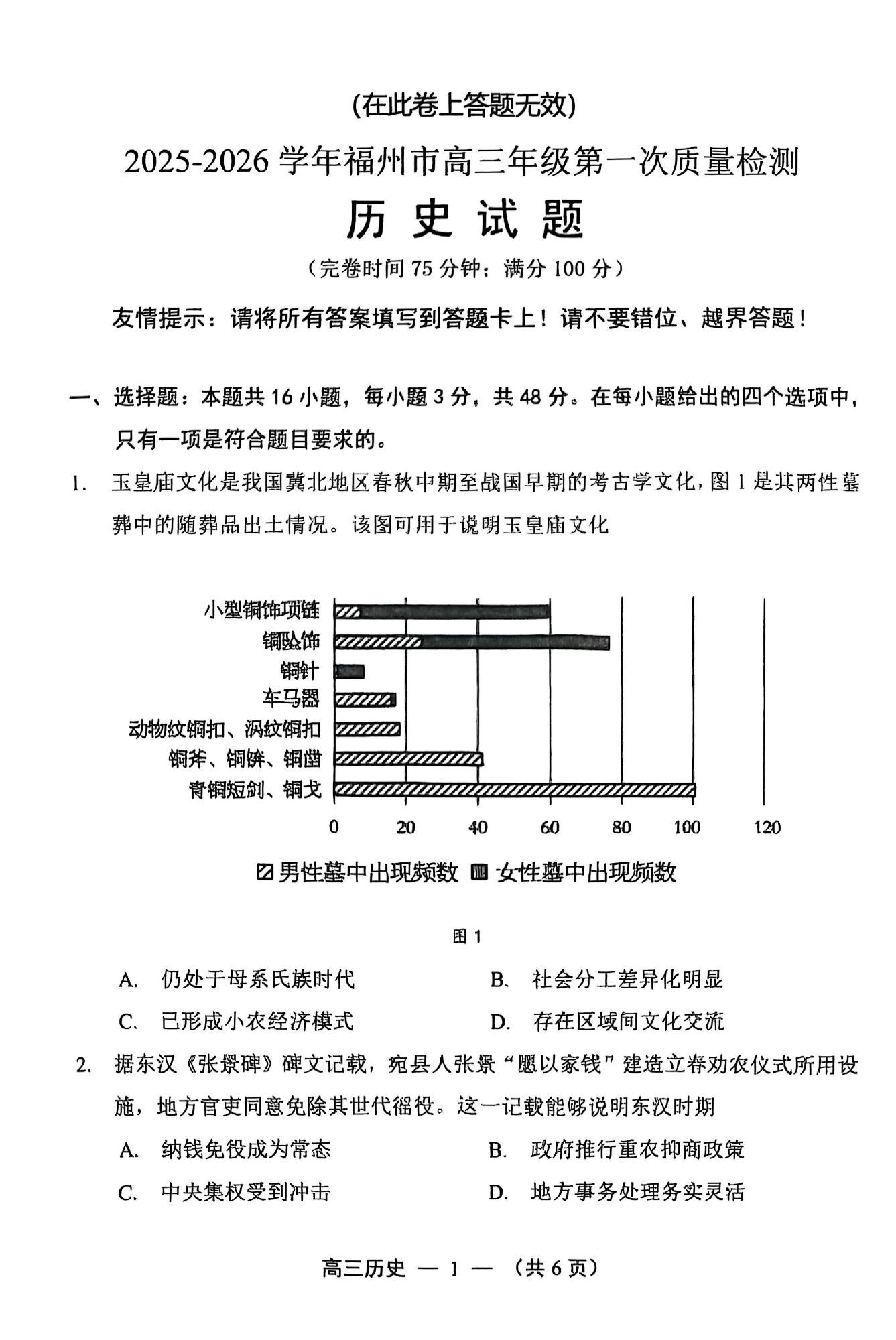 高三历史--福建省福州市2026届高三年级第一次质量检测(福州一检)