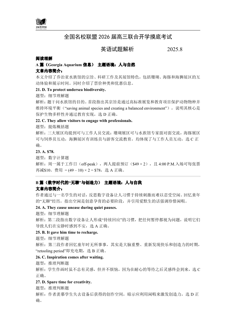 高三英语答案--福建省全国名校联盟2026届高三8月联合开学摸底考试