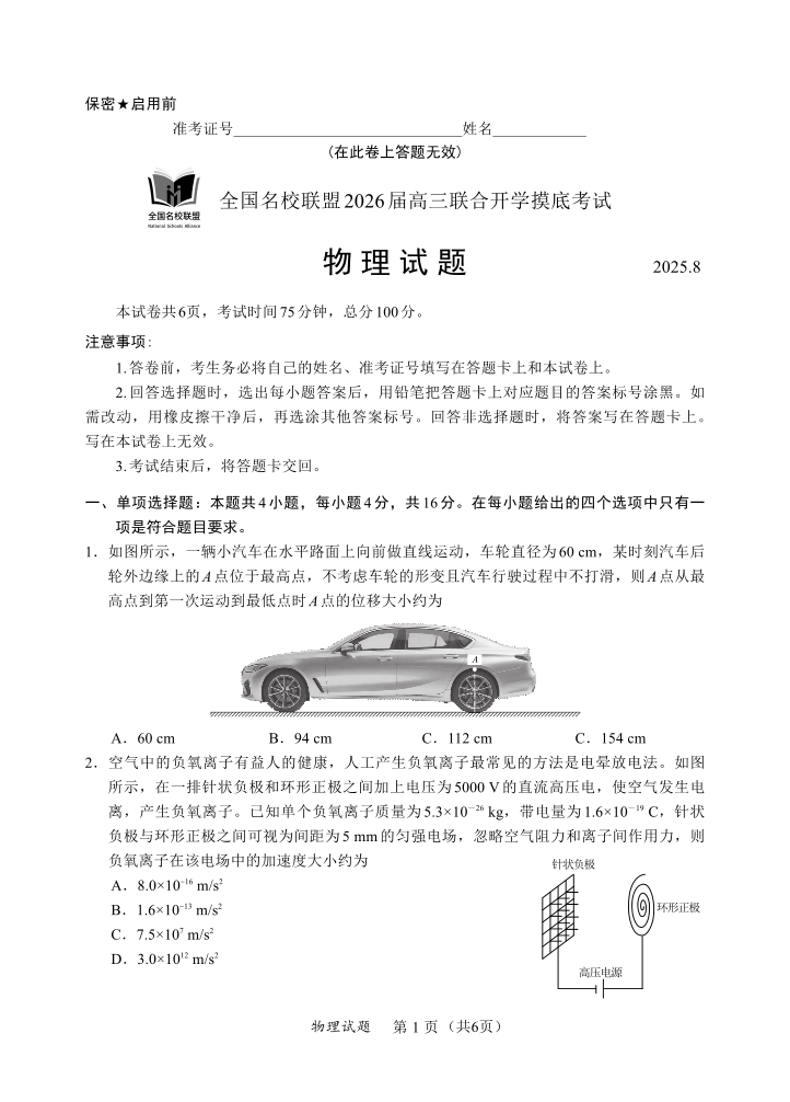 高三物理--福建省全国名校联盟2026届高三8月联合开学摸底考试