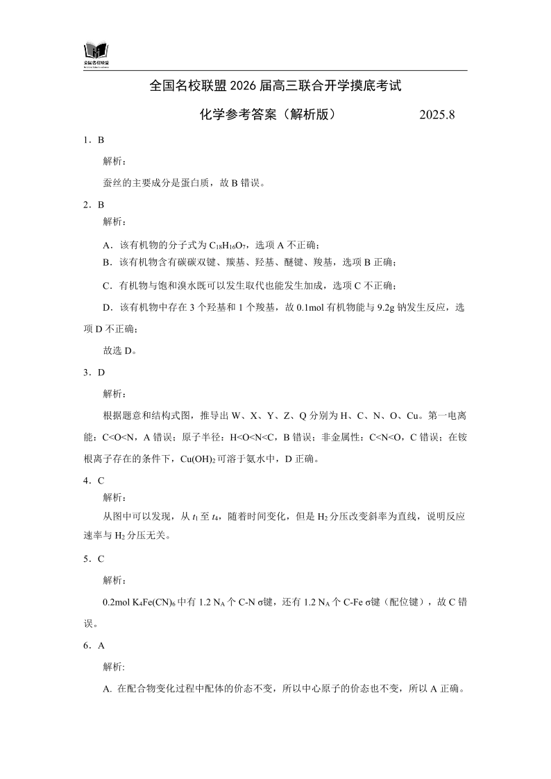 高三化学答案--福建省全国名校联盟2026届高三8月联合开学摸底考试