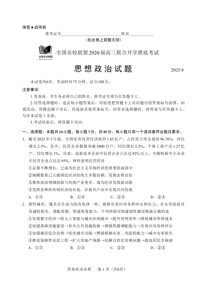 高三政治--福建省全国名校联盟2026届高三8月联合开学摸底考试