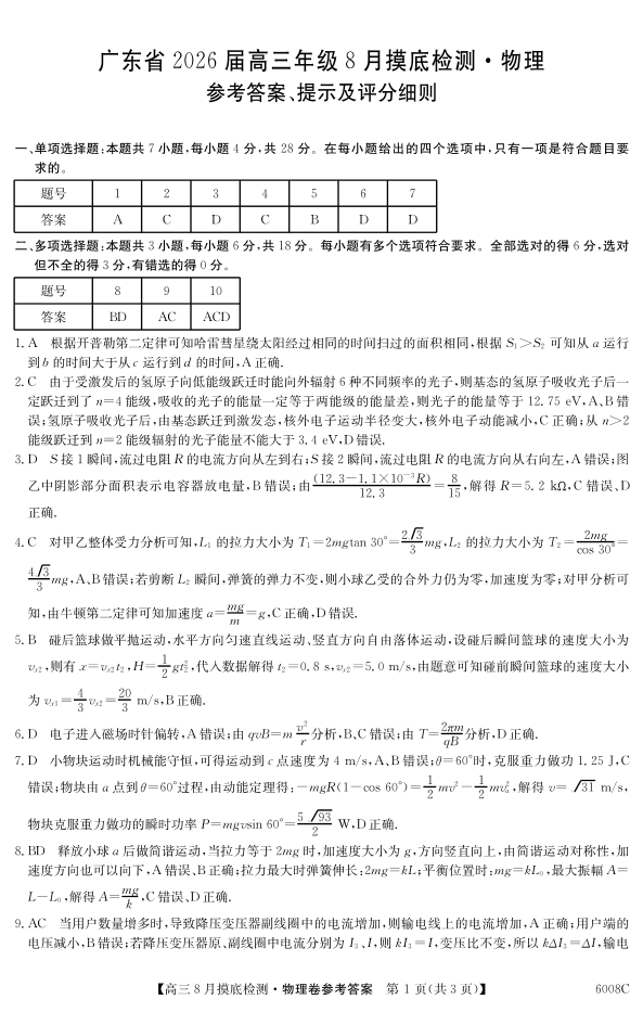 高三物理答案--广东省纵千文化2026届高三8月摸底检测