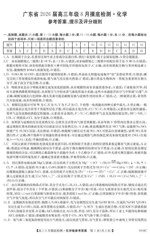 高三化学答案--广东省纵千文化2026届高三8月摸底检测