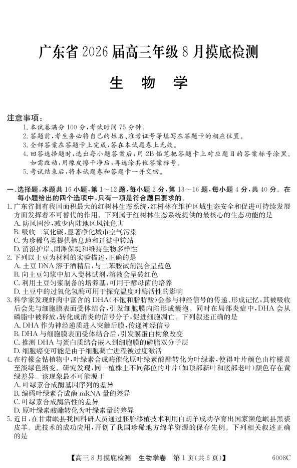 高三生物--广东省纵千文化2026届高三8月摸底检测