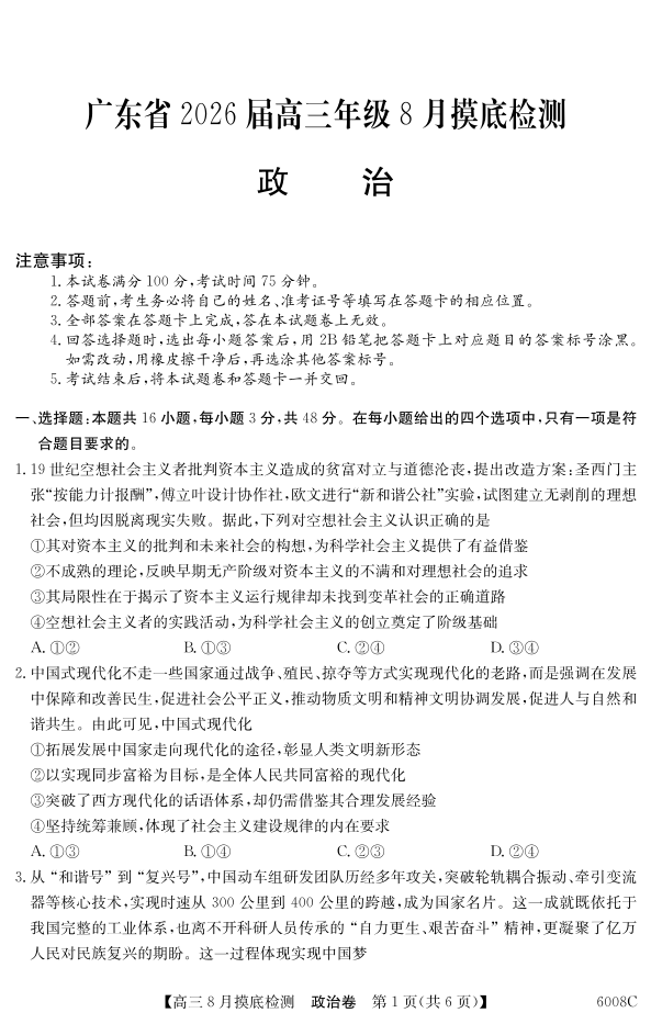 高三政治--广东省纵千文化2026届高三8月摸底检测