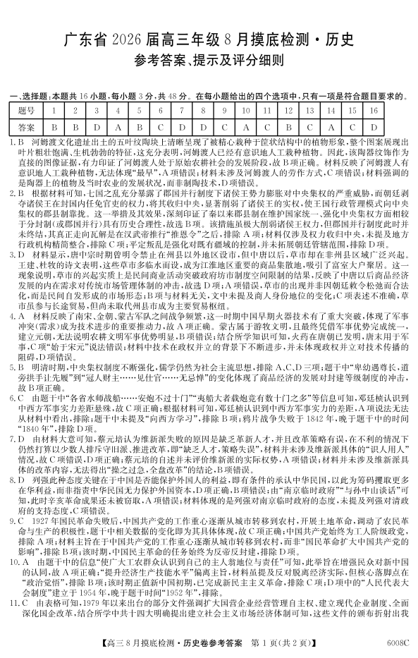 高三历史答案--广东省纵千文化2026届高三8月摸底检测