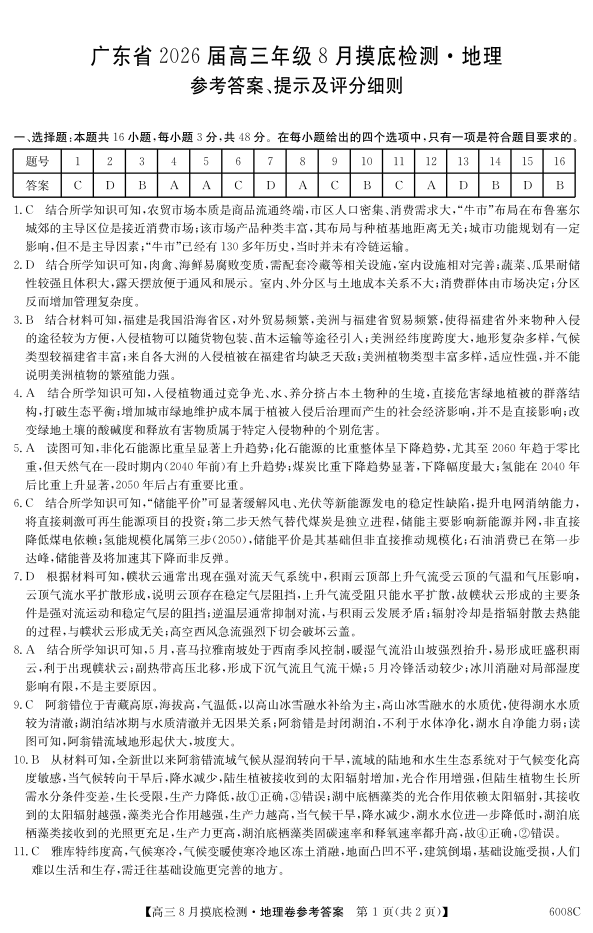 高三地理答案--广东省纵千文化2026届高三8月摸底检测
