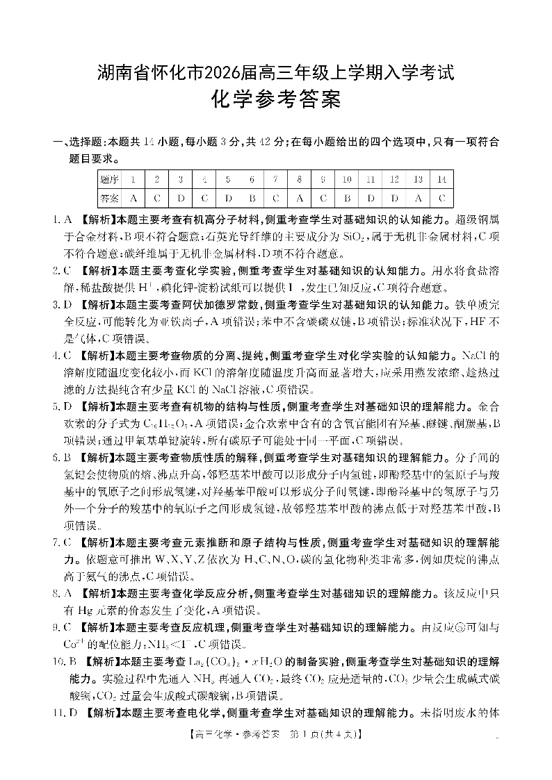 高三化学答案--湖南省怀化市2026届高三上学期8月开学考试