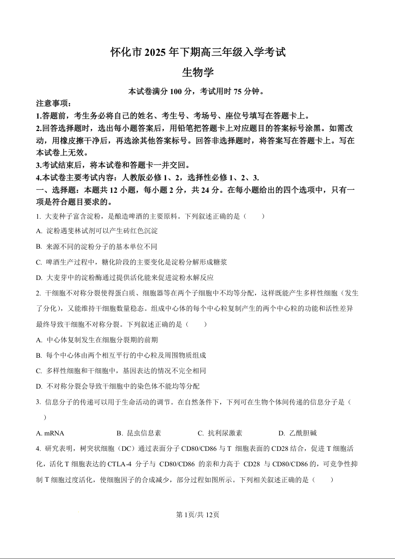 高三生物+答案--湖南省怀化市2026届高三上学期8月开学考试