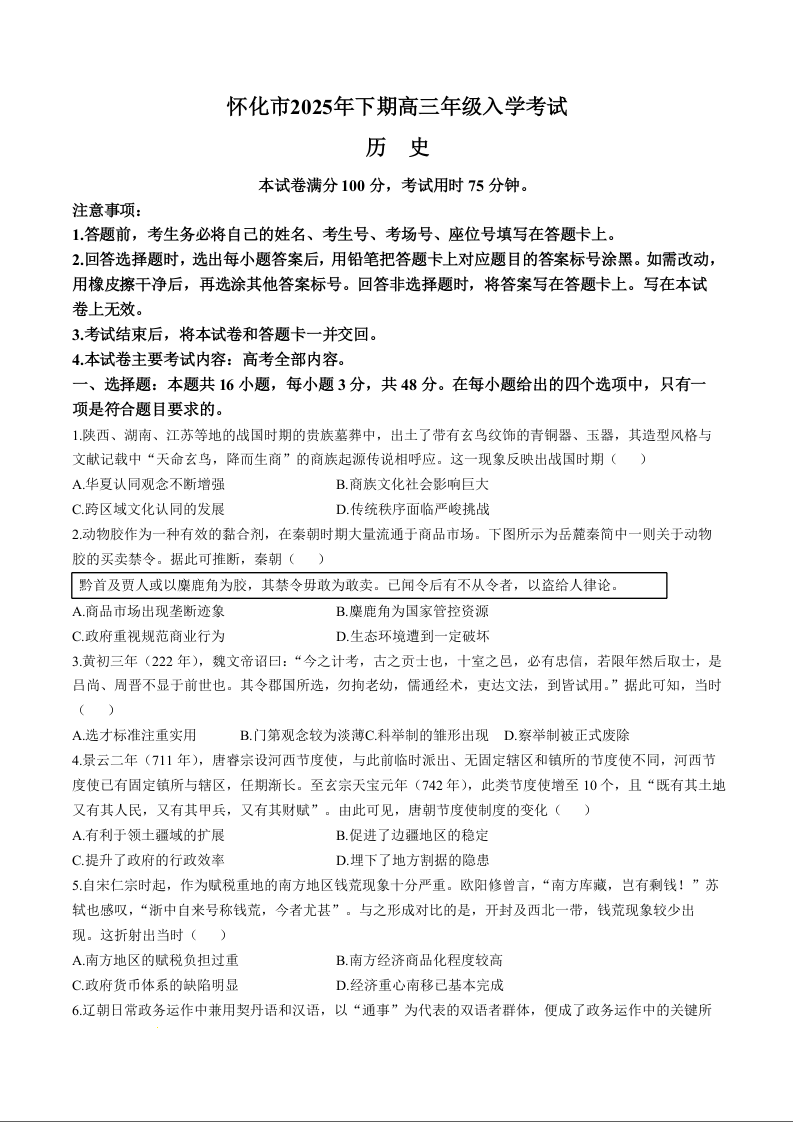 高三历史+答案--湖南省怀化市2026届高三上学期8月开学考试