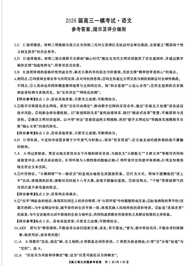 高三语文答案--湖南省天壹名校联盟2026届高三8月入学考试