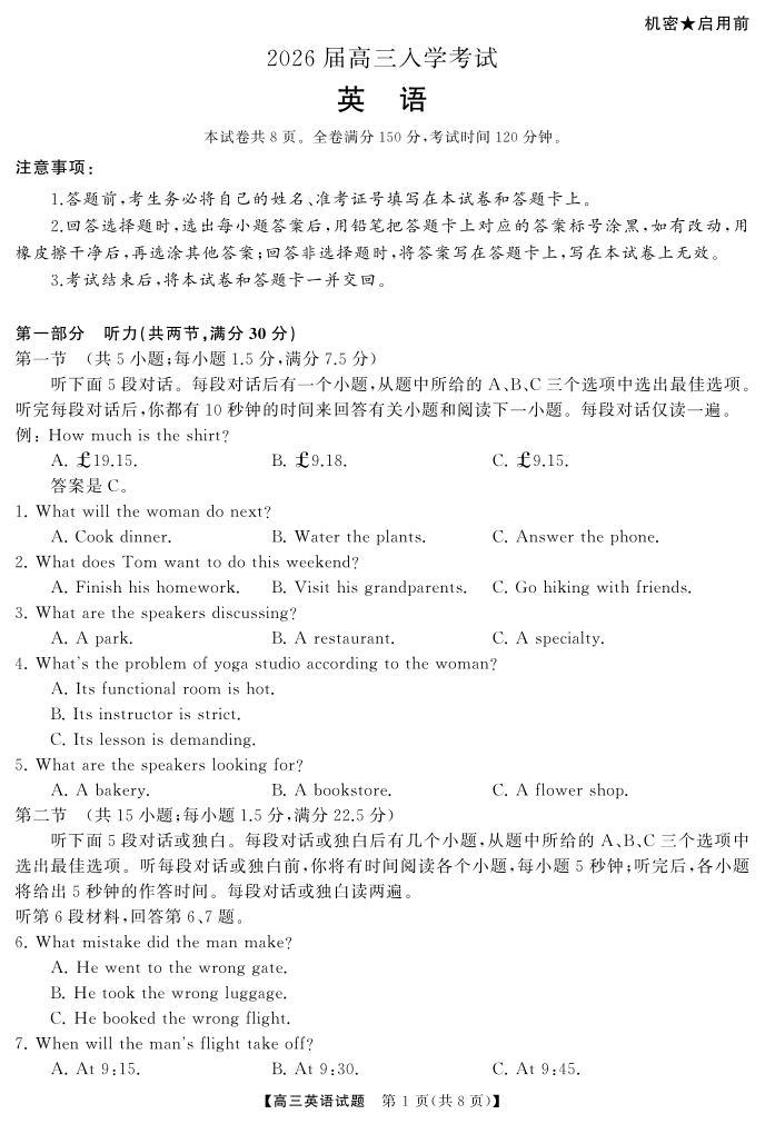 高三英语--湖南省天壹名校联盟2026届高三8月入学考试