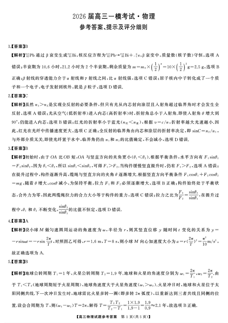 高三物理答案--湖南省天壹名校联盟2026届高三8月入学考试