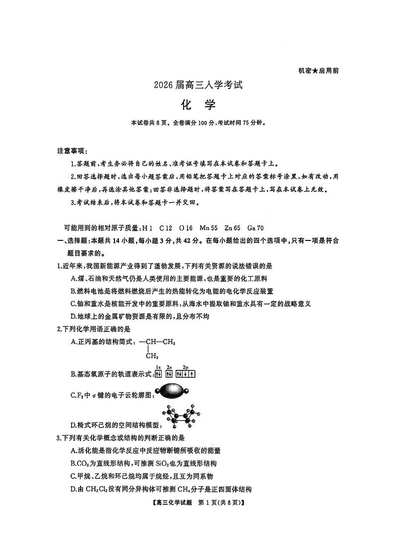 高三化学--湖南省天壹名校联盟2026届高三8月入学考试