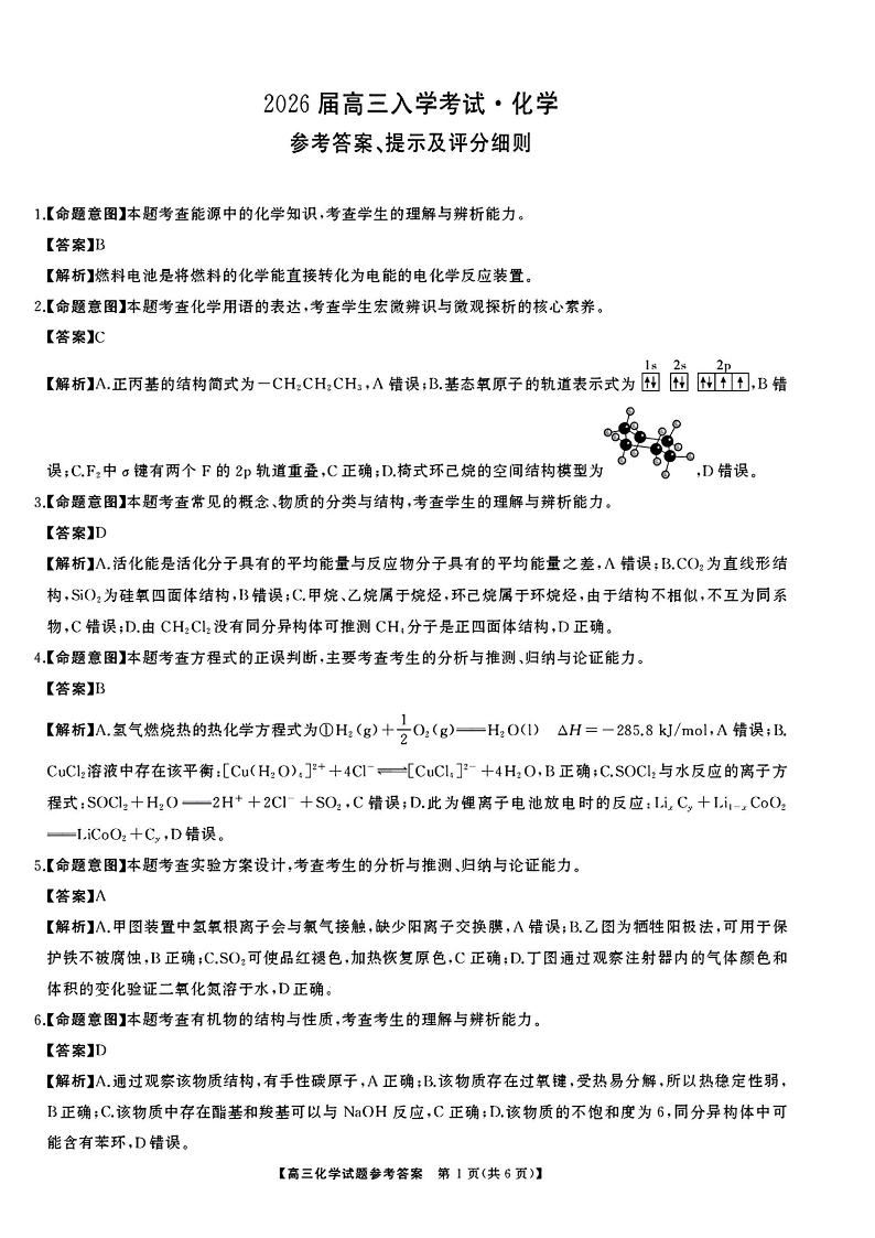 高三化学答案--湖南省天壹名校联盟2026届高三8月入学考试