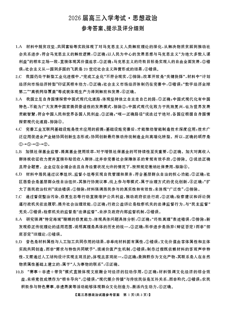 高三政治答案--湖南省天壹名校联盟2026届高三8月入学考试