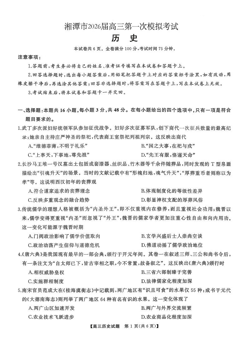 高三历史--湖南省天壹名校联盟2026届高三8月入学考试