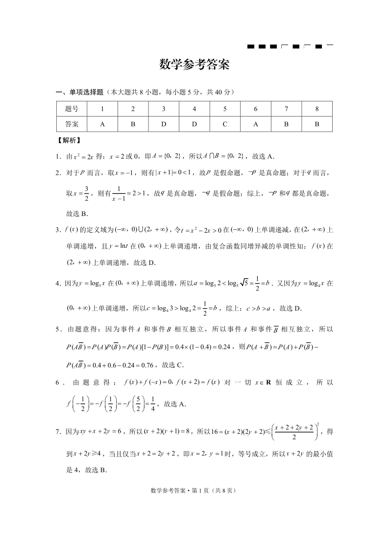 高三数学答案--重庆市巴蜀中学2026届高考适应性月考卷(一)