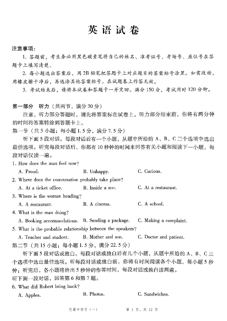 高三英语--重庆市巴蜀中学2026届高考适应性月考卷(一)