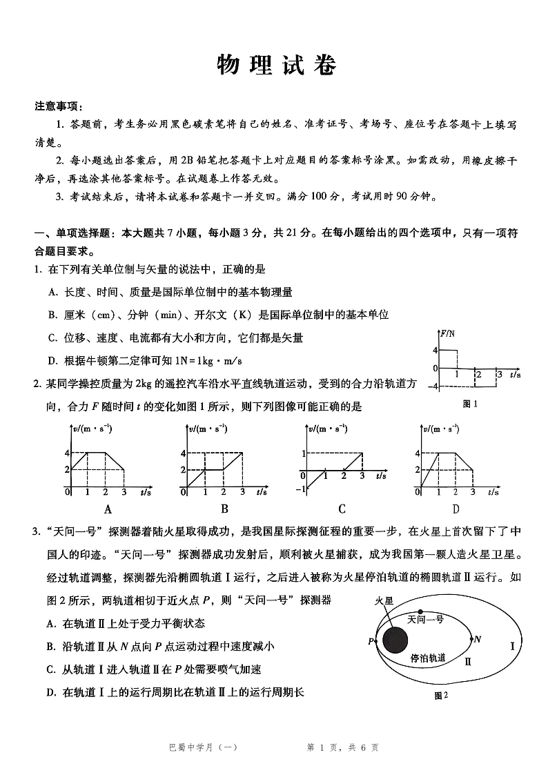 高三物理--重庆市巴蜀中学2026届高考适应性月考卷(一)