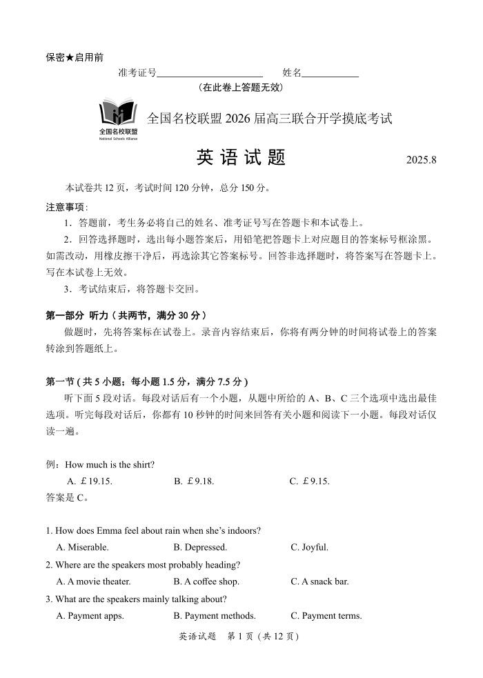 高三英语--内蒙古全国名校联盟2026届高三8月联合开学摸底考试