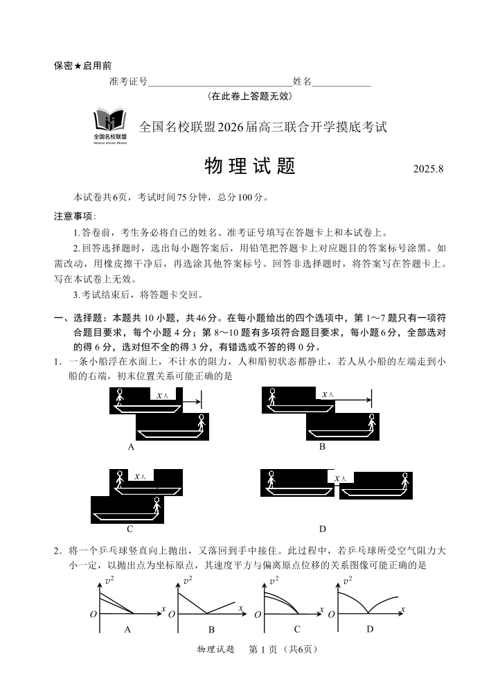 高三物理--内蒙古全国名校联盟2026届高三8月联合开学摸底考试