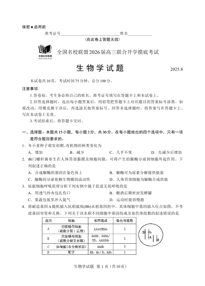 高三生物--内蒙古全国名校联盟2026届高三8月联合开学摸底考试