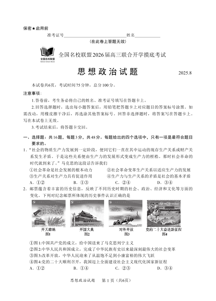高三政治--内蒙古全国名校联盟2026届高三8月联合开学摸底考试