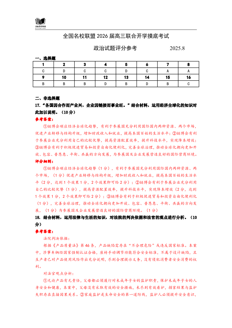 高三政治答案--内蒙古全国名校联盟2026届高三8月联合开学摸底考试