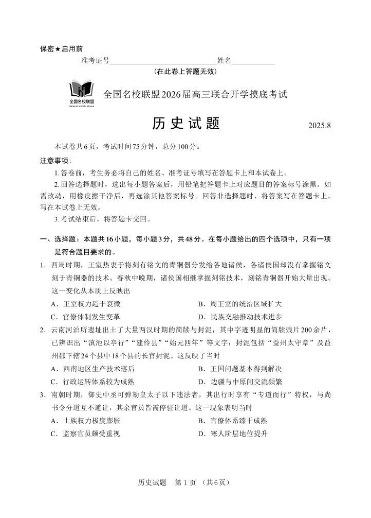 高三历史--内蒙古全国名校联盟2026届高三8月联合开学摸底考试