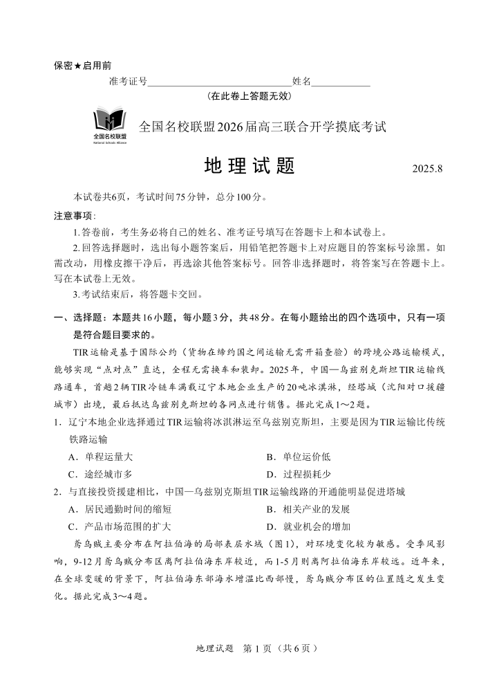 高三地理--内蒙古全国名校联盟2026届高三8月联合开学摸底考试