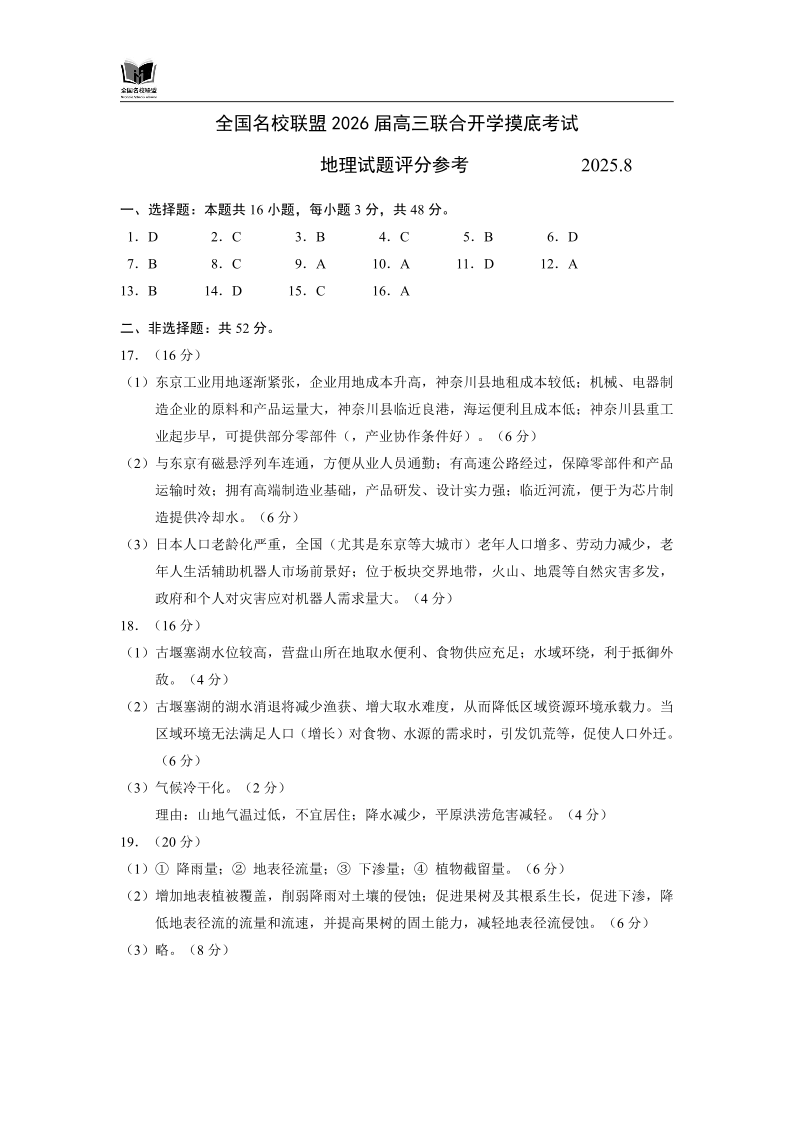 高三地理答案--内蒙古全国名校联盟2026届高三8月联合开学摸底考试